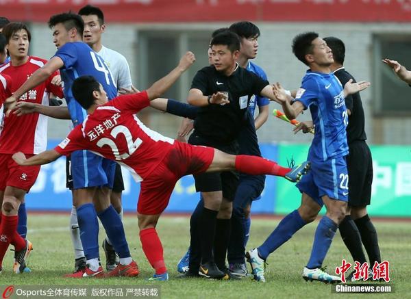 5月11日下午,2016年中国足协杯第三轮继续进行,业余球队武汉宏兴在主场0-1不敌足协杯卫冕冠军江苏苏宁。最后时刻两队发生冲突,苏宁球员谢鹏飞疑似遭到群殴。图片来源:Osports全体育图片社