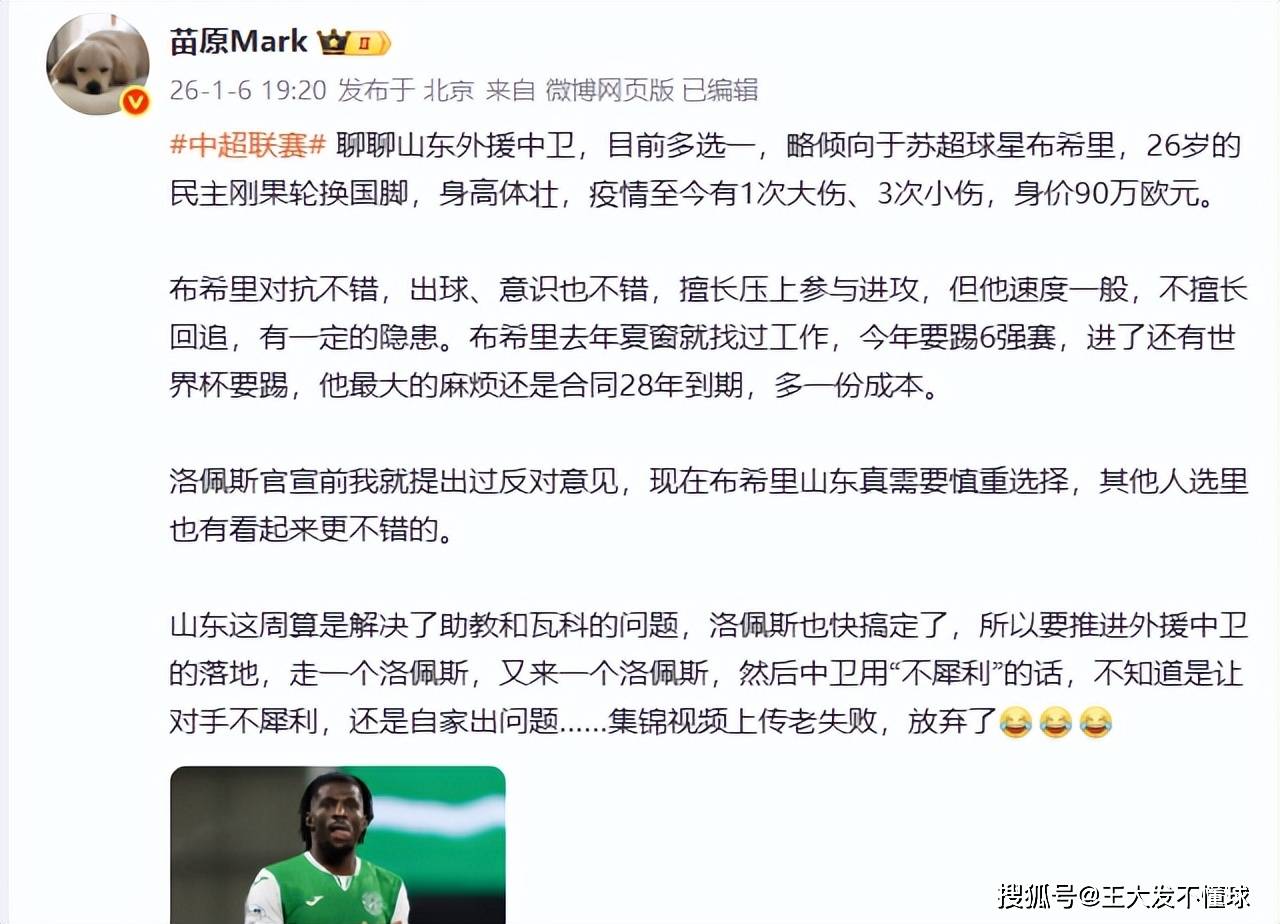 6日晚上19点20分,媒体人苗原也透露了山东泰山队新后卫外援的最新动态。他发文表示山东外援中卫,目前多选一,略倾向于苏超球星布希里,26岁的民主刚果轮换国脚,身高体壮,疫情至今有1次大伤、3次小伤,身价90万欧元。布希里对抗不错,出球、意识也不错,擅长压上参与进攻,但他速度一般,不擅长回追,有一定的隐患。布希里去年夏窗就找过工作,今年要踢6强赛,进了还有世界杯要踢,他最大的麻烦还是合同28年到期,多一份成本。