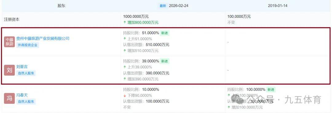 2026年1月末,成都顶耀锦城足球俱乐部进行增资扩股,注册资本从100万元增至1000万元,新增两名股东,分别是贵州中藤旅游产业发展有限公司(以下简称“贵州中藤”)、刘釜言,分别认缴510万元、390万元,持股比例分别为51%、39%。
