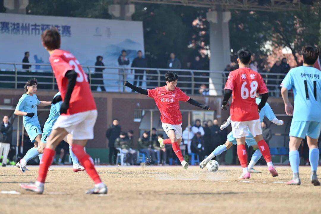 长兴队对阵南浔队的比赛中,双方球员紧盯对手,两队均未能攻破对方球门,势均力敌的胶着态势延续至上半场结束,双方打成0:0平手。