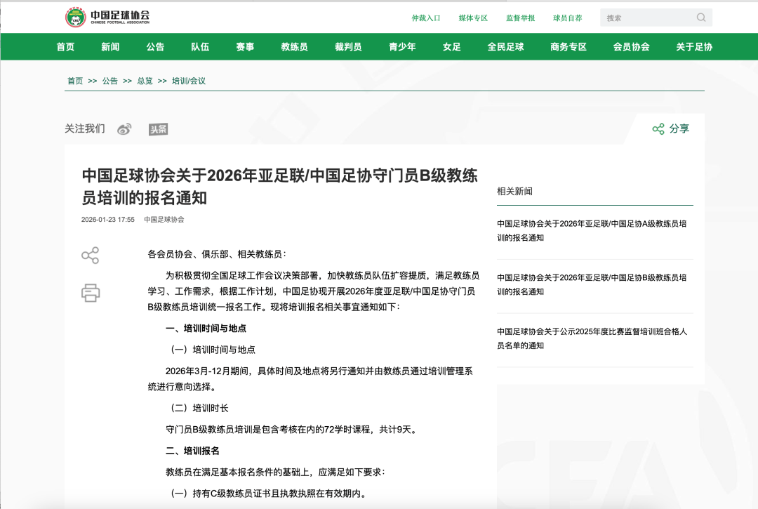 中国足球协会关于2026年亚足联/中国足协守门员B级教练员培训的报名通知