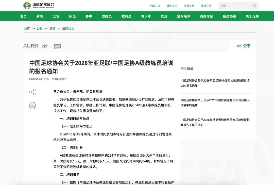 中国足球协会关于2026年亚足联/中国足协精英青训A级教练员培训班的报名通知