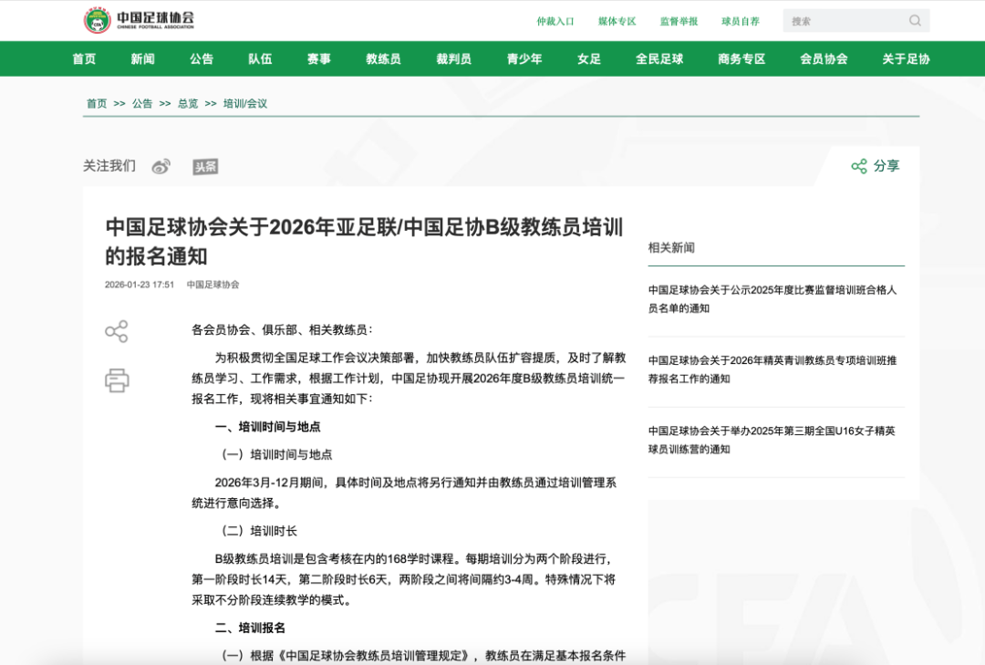 中国足球协会关于2026年亚足联/中国足协精英青训B级教练员培训班的报名通知
